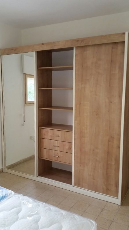 ארון דלתות הזזה בצבע עץ בשילוב מראה כולל מגירות פנימיות