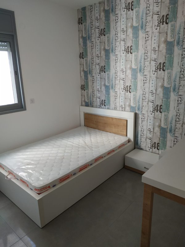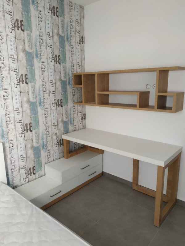 חדר נוער מעוצב בהזמנה אישית. כולל מיטה, ארון, פינת עבודה ומדפים תלויים.
