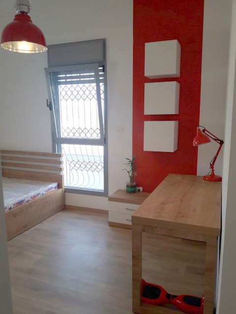חדר ילדים כולל פינת עבודה, ארון ומיטה.